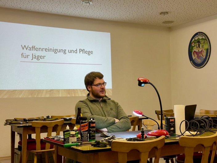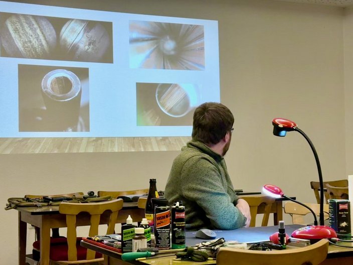 Neben der Theorie (Pflege von bspw. Lauf, System, Verschluss, Schaft) sind im praktischen Teil Methoden und Materialien zum Reinigen der entsprechenden Bauteile präsentiert und vorgeführt worden.