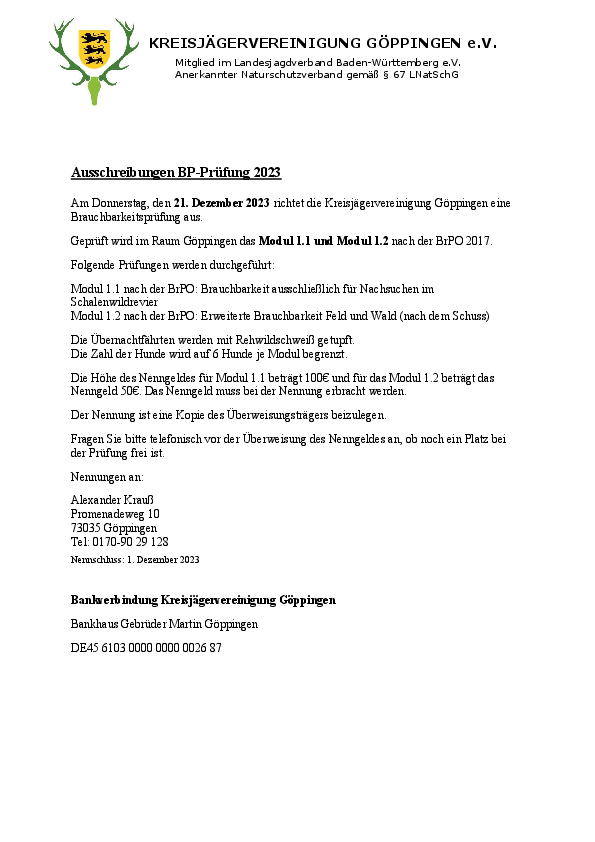 Am Donnerstag, den 21. Dezember 2023 richtet die Kreisjägervereinigung Göppingen eine Brauchbarkeitsprüfung aus.