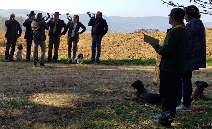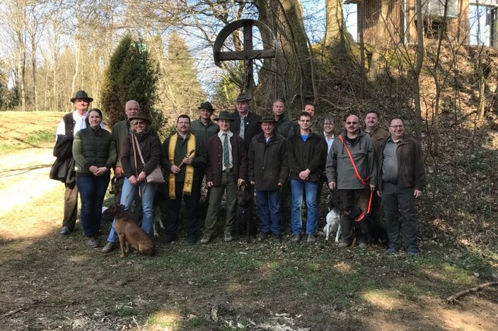 Bei schönstem Wetter, im Wald an einem Wegkreuz, untermalt von den Jagdhörnern ein gelungenes Ereignis.