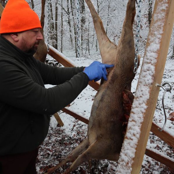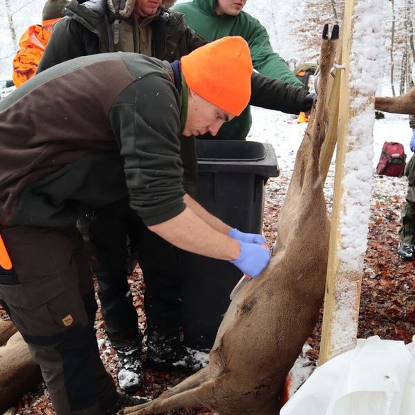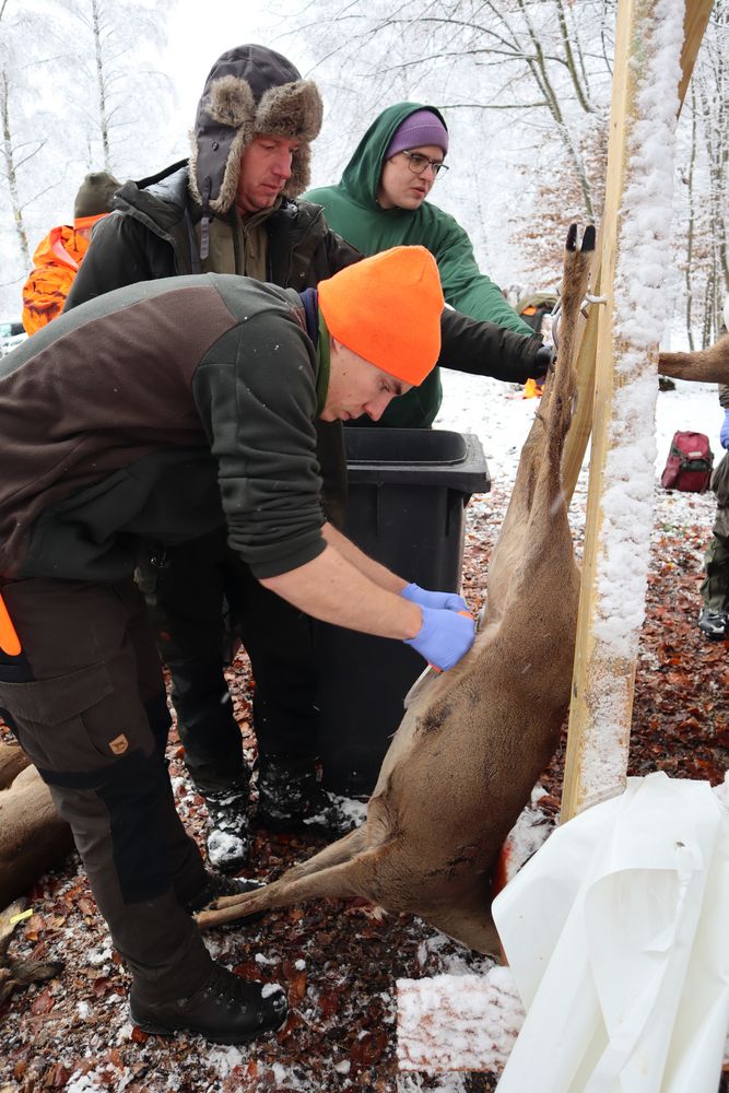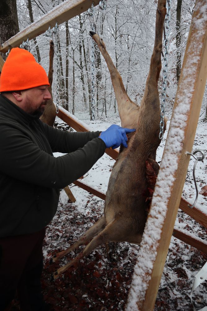Im Anschluss ging es in den Stauferwald zum Aufbrechen, wo jeder Schüler Hand anlegen konnte und unter sachkundiger Anleitung ein Reh aufbrechen durfte. Erkennbar waren die verschiedenen Trefferlagen, wo auch mal ein Pansen getroffen wurde (Waidwundschuss), aber auch hier haben die erfahrenen anwesenden Metzger gleich gezeigt, wie solche entwerteten Teile abgeschärft und entsorgt werden. Auch die Untersuchung nach bedenklichen Merkmalen wie Erkrankungen, Organkontrolle usw. wurden direkt durchgeführt und die fertigen Stücke in die Kühlkammer gehängt.