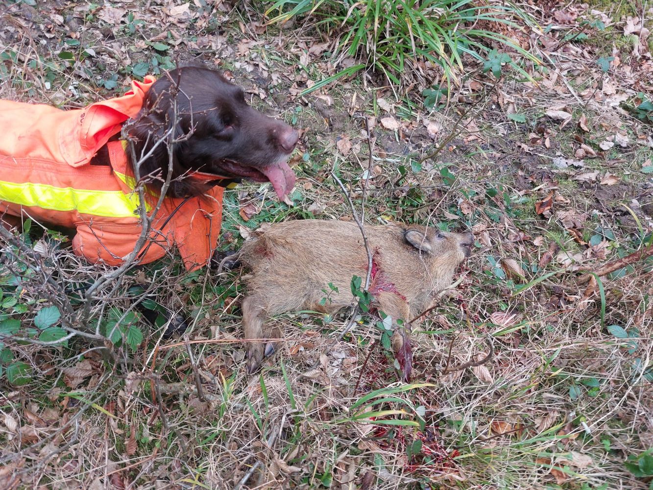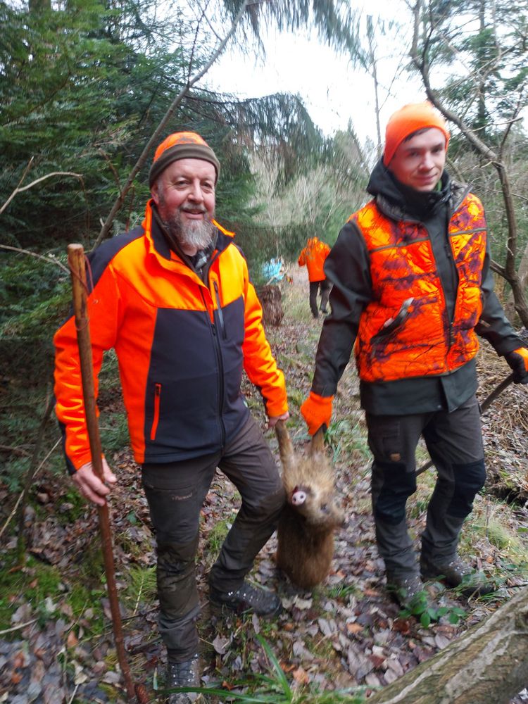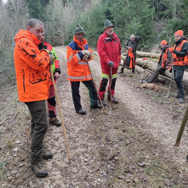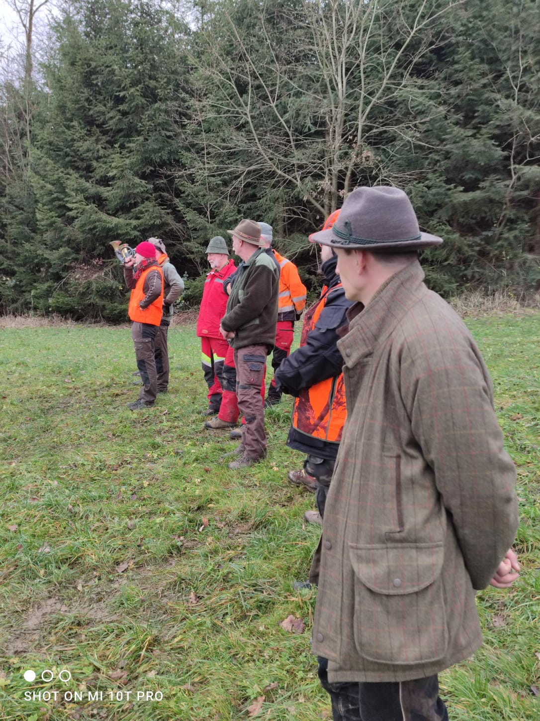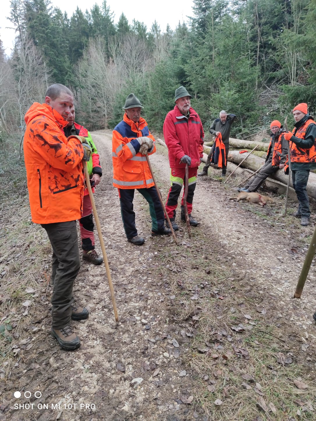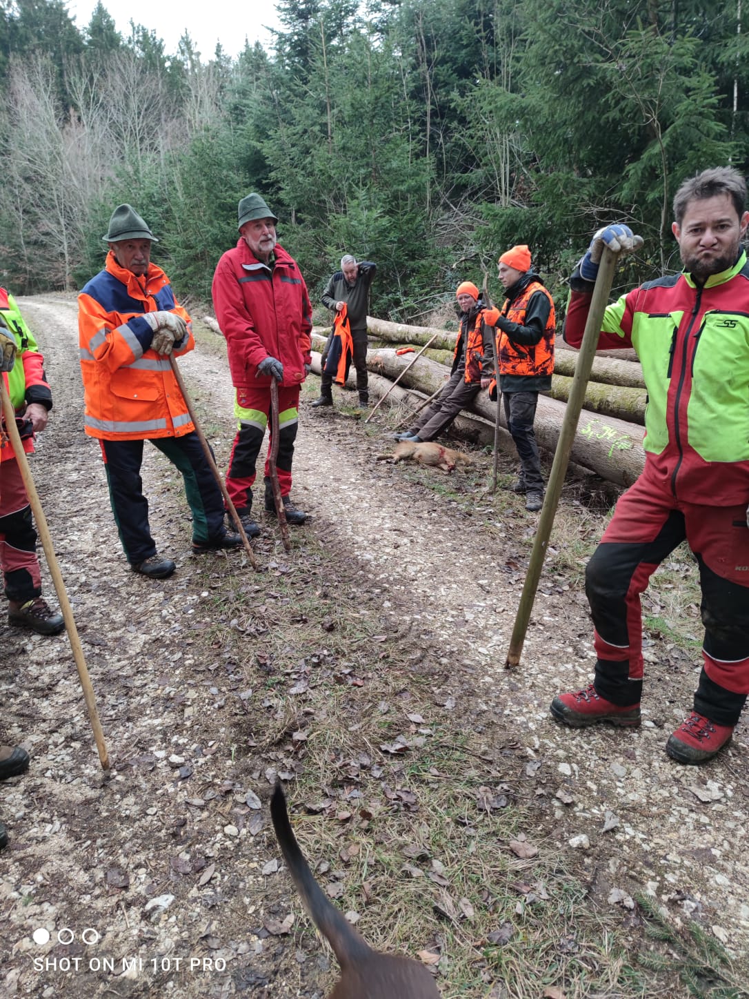 Nach der Ansprache ging es auch gleich los mit dem Anstellen der Schützen und der Einteilung der Treiberwehren. Die Treiber hatten sehr unwegsames Gelände vor sich und mussten sich durch Brombeere und Co. (teilweise in Hängen) schlagen. Auch die Hunde hatten Ihren Auslauf, einer wurde leicht am Rücken verletzt, konnte aber gleich vor Ort versorgt werden und wurde später zum Tierarzt gebracht.