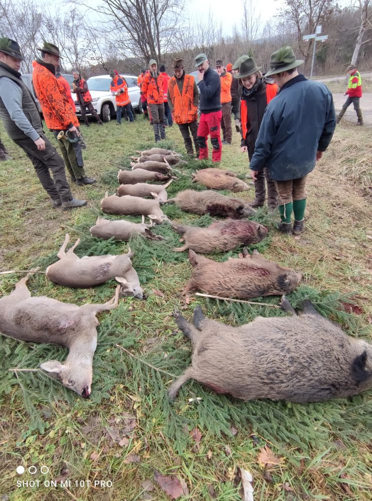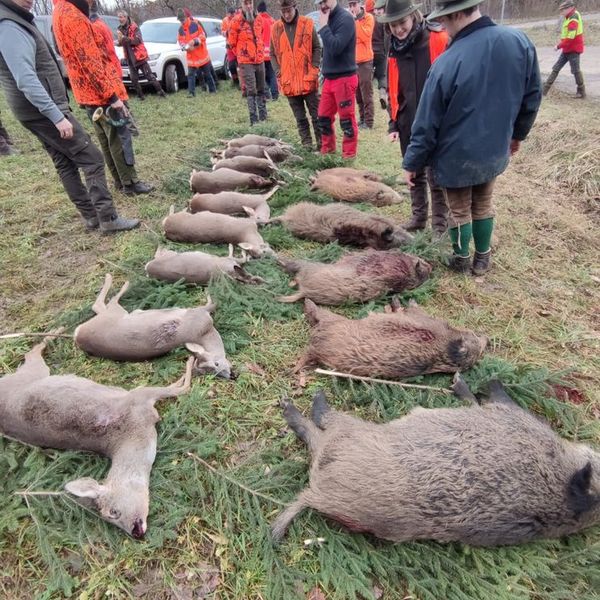 Auf der Strecke lagen 6 Sauen und 9 Rehe. Nach dem Verblasen der Strecke und dem Überreichen der Brüche gab es Leberkäs- und Schnitzelwecken und ausreichend Zeit für Fragen, Diskussionen und Gespräche aller Art.